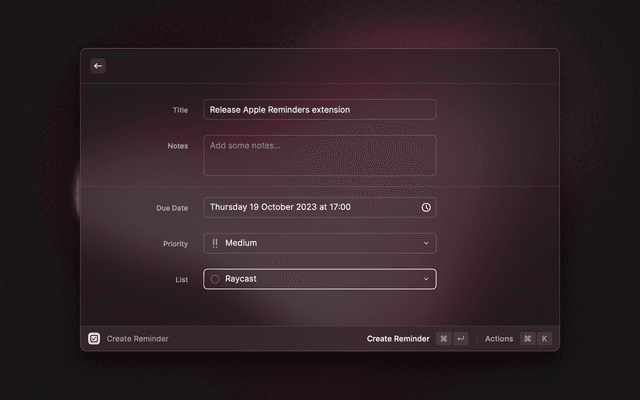 You can open the customization UI either from Raycast search with the "Customize Create Reminder Form" command or from the action panel inside "Create Reminder."