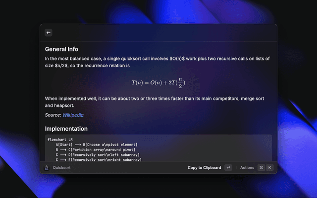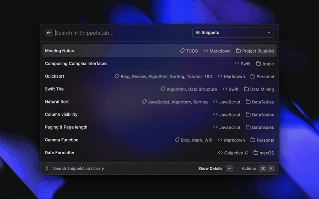 - Search for any snippet in your SnippetsLab library directly from Raycast.