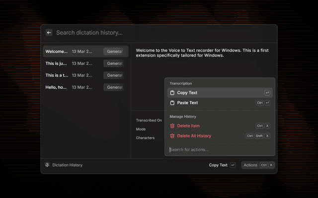 - Dictation history — browse, search, copy, and paste past transcriptions