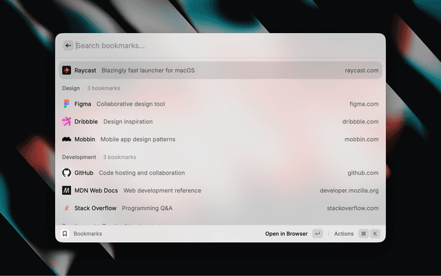 A Raycast extension that uses a markdown file as the persistence layer for your bookmarks. Organize your bookmarks with hierarchical groups using markdown headings.