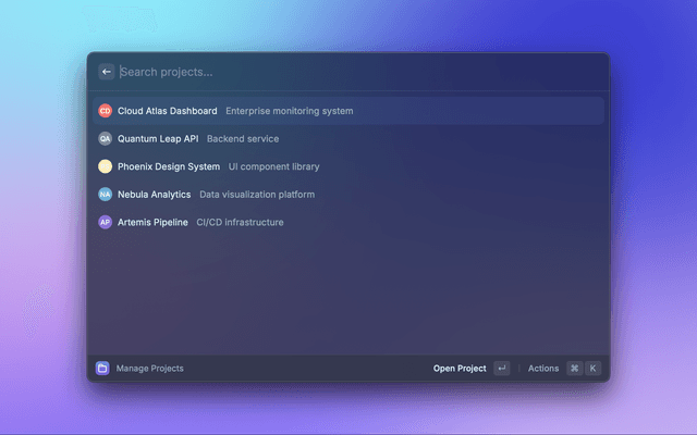 • Keyboard shortcuts for efficient navigation (⌘1, ⌘2, ⌘3 for recent projects)