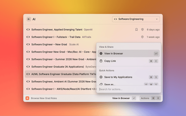Onbo transforms the chaotic job search experience into a streamlined, keyboard-driven workflow within Raycast. Built specifically for college students and new grads entering tech, it lets you find roles and track applications without juggling tabs, spreadsheets, and bookmarks.