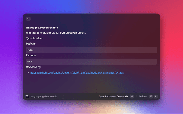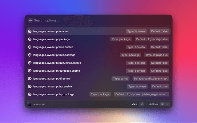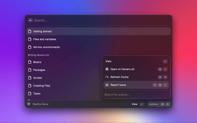 Simply open Raycast and search for "DevEnv Docs" to start browsing the documentation. Use the search bar to filter through available documentation pages and options.