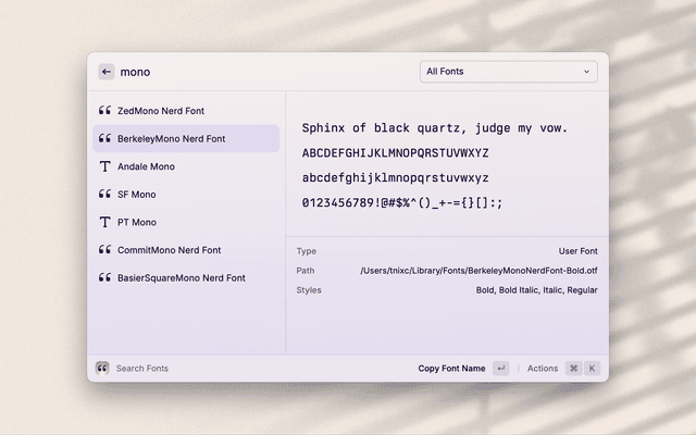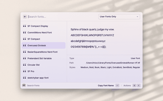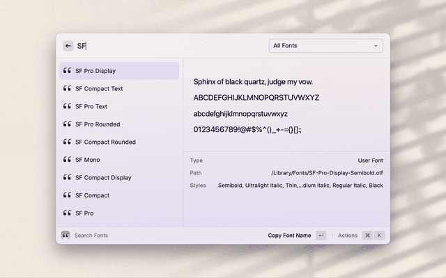 Search installed fonts, as displayed in font book.
