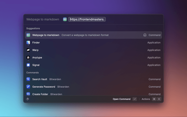 Transform any webpage into clean markdown. View directly in Raycast or copy to clipboard. Perfect for developers, note-takers and content-creators who need to save web content in markdown format.